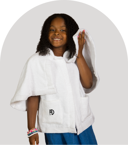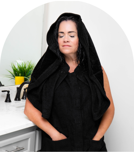 Before you start your beauty routine, wrap yourself in the comfort of Hair Drip Wear. Its secure and absorbent design makes it an ideal companion for makeup application, keeping your outfit satin-free!